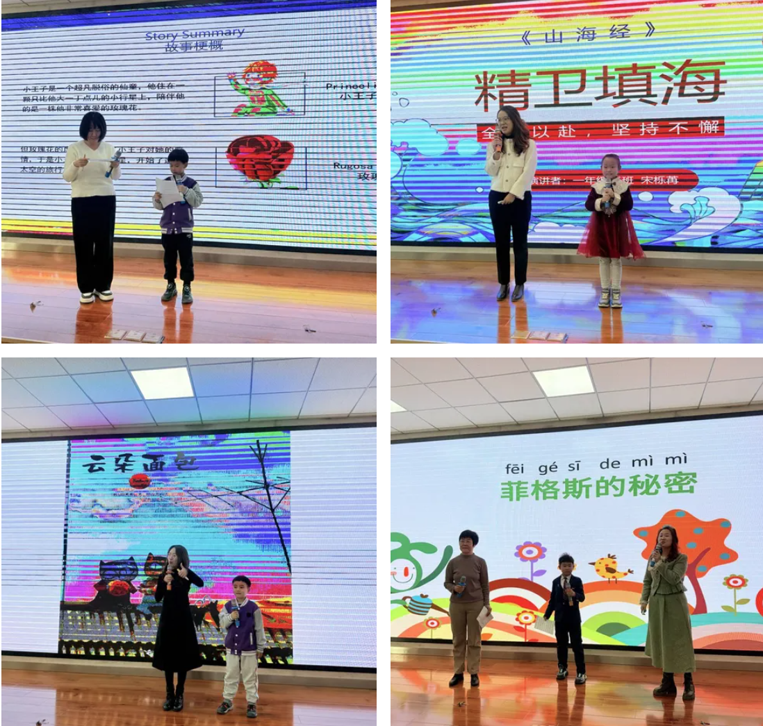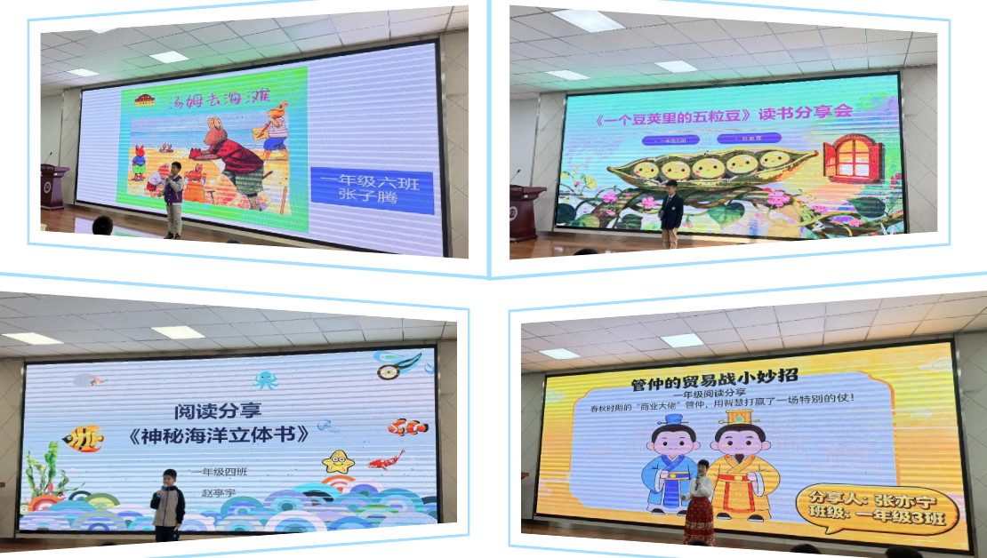 个人分享环节中,10位小分享家按班级依次登台,用纯净童声传递书中天地。1班王煜祺解锁《好奇号》的科学奥秘,2班柳珞祺解读《指鹿为马》的古人智慧,3班张亦宁让《管仲的贸易战小妙招》焕发历史活力,4班赵亭宇引领探索《神秘海洋立体书》的深海奇境,5班刘政霖分享《一个豆荚里的五粒豆》蕴含的生命力量。此外,《汤姆去海滩》的童趣、《有一粒米思念袁隆平爷爷》的感恩、《点点鼠的故事》的灵动、《西游记》的古典韵味,都在小分享家们的讲述中鲜活呈现。互动提问环节里,孩子们从容应答,尽显扎实的阅读积累与清晰的逻辑思维。