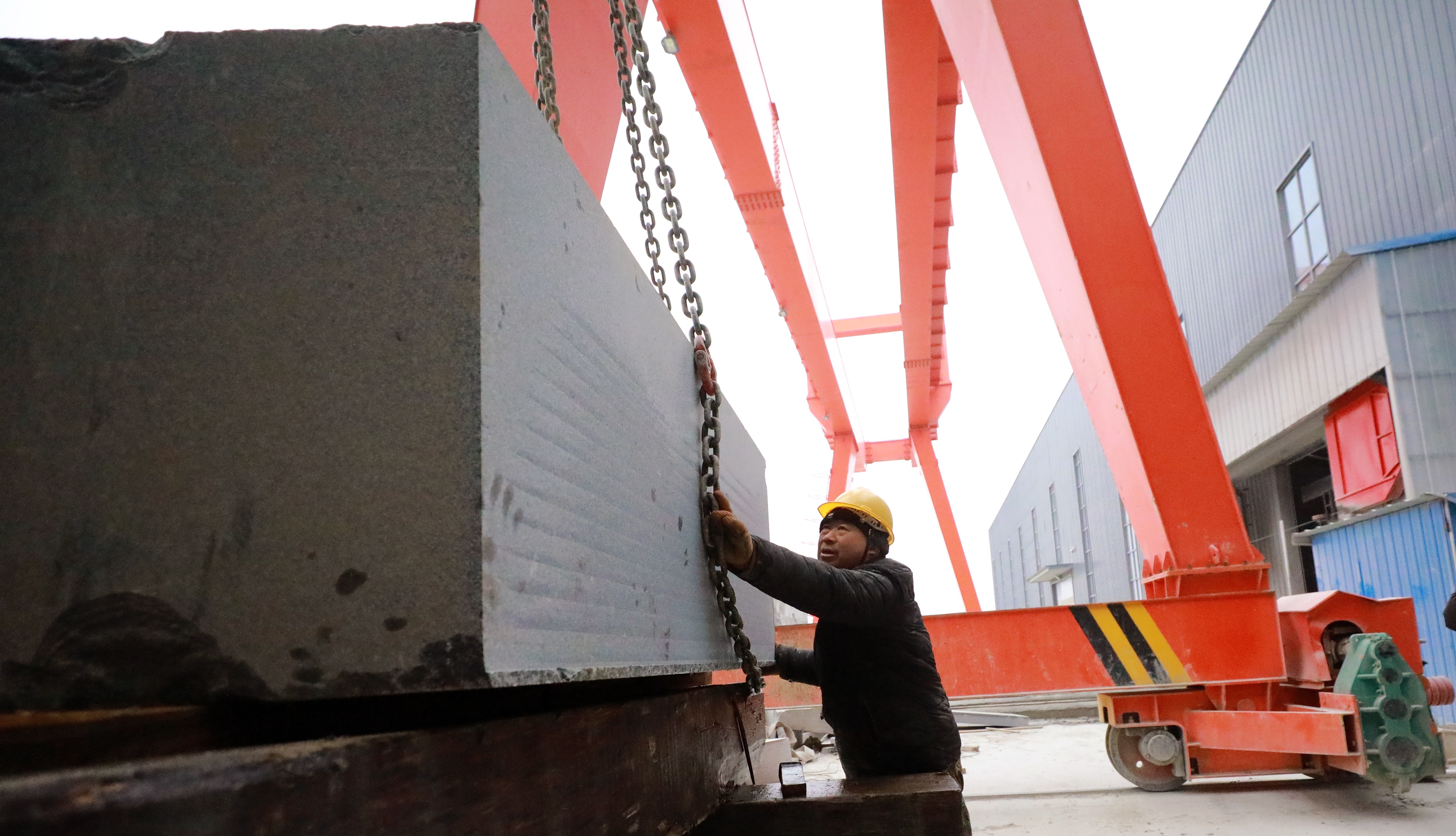 近日,在滨州市无棣县西小王镇的无棣县品佳石材有限公司的厂房内,近20台大型龙锯、绳锯等机器正在轰鸣,进行石材切割,工人们紧张有序地把石材运入、把切割好的产品运出、入库。