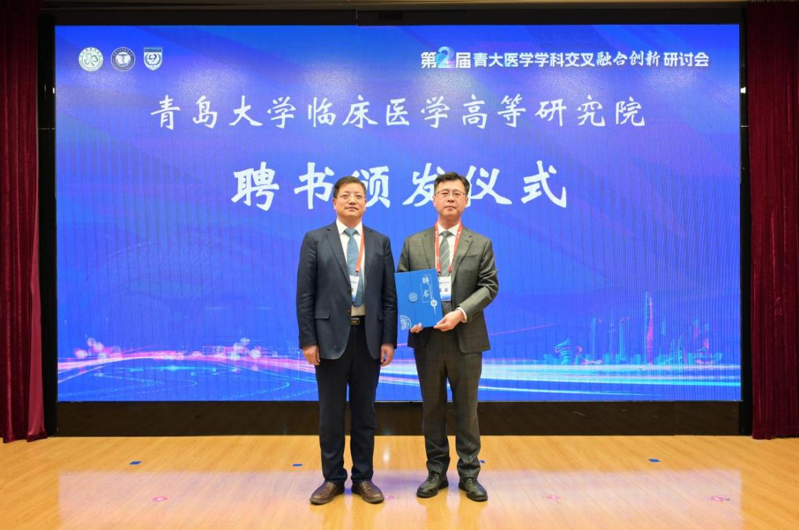 开幕式上,魏志强和牛海涛共同为青岛大学特种医学交叉创新研究院揭牌,标志着该校在特种医学交叉创新领域迈出关键一步。魏志强还为青岛大学临床医学高等研究院院长牛海涛颁发聘书,并为常务副院长蒋光峰,副院长任贺、李环廷、宋西成、李兵、泮思林及院务委员会委员颁发聘书,为临床医学高等研究院的高质量发展搭建起坚实的组织框架。