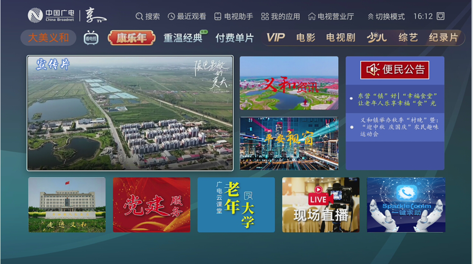 拓展文化服务阵地,精准对接多元需求。颐正新村通过与中国广电东营分公司合作,投入9万元搭建社区智慧电视服务平台,精心开发适老化、个性化数字资源界面,为新村群众打造集便民公告、智慧党建、义和资讯、走进义和、老年大学、现场直播、一键呼叫于一体的综合性服务平台,精准匹配不同群体的信息需求。同时,依托平台高普及率、广覆盖面优势,联动线下宣传渠道,定向推广休闲农业、乡村旅游资源及特色农产品,以“线上引流+线下体验”的融合模式,助力乡村文旅产业升级、特色产业提质及农产品品牌塑造,为乡村经济高质量发展注入新活力。