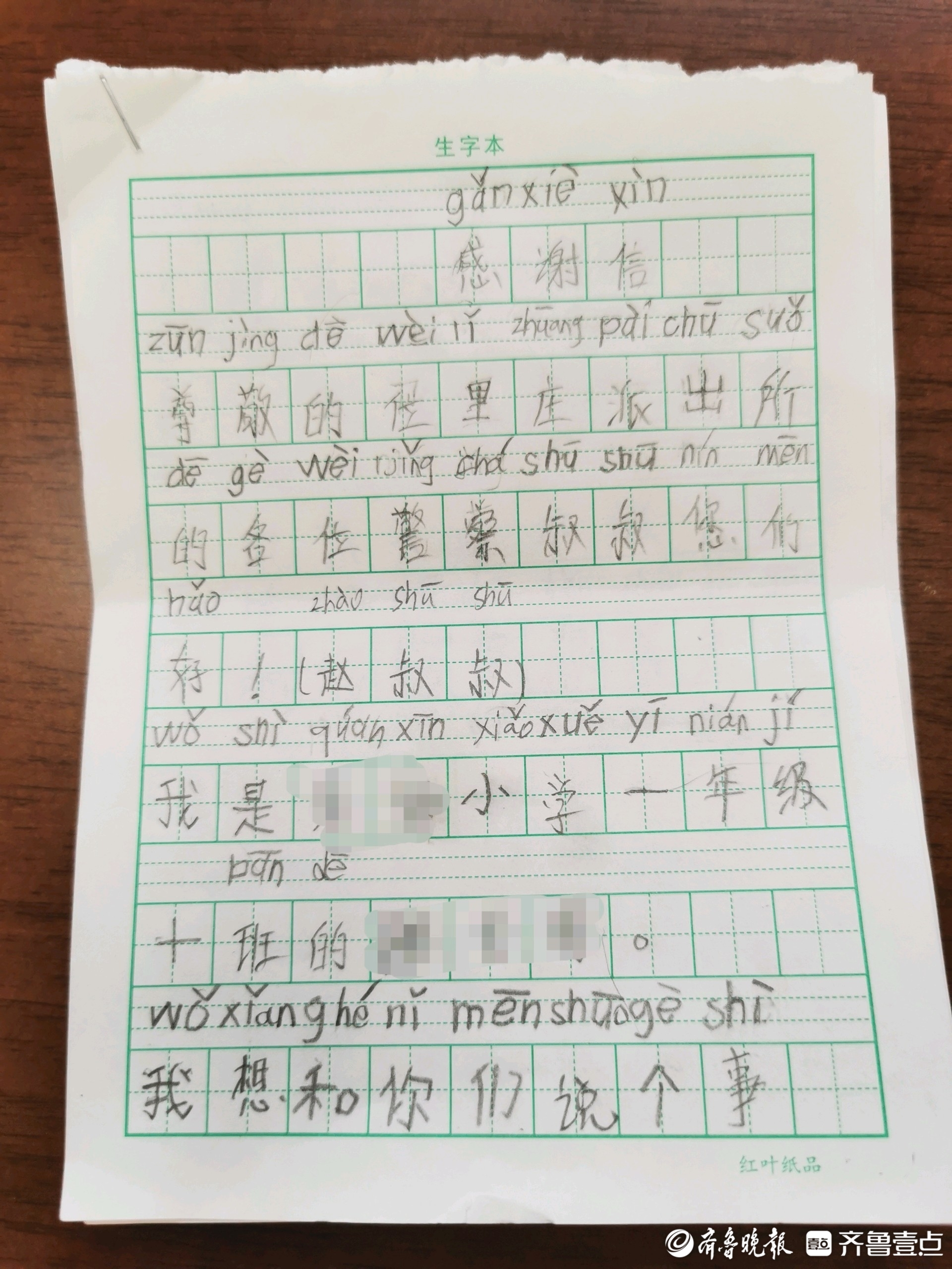 近日,济南公安轨交分局位里庄派出所收到了一封特殊的感谢信——由拼音与汉字共同写成,来自一位刚上一年级的小学生。信中,这名小学生认真写道:“这件事对我影响很大,我长大要做个像警察叔叔一样的人,多为社会做贡献。”