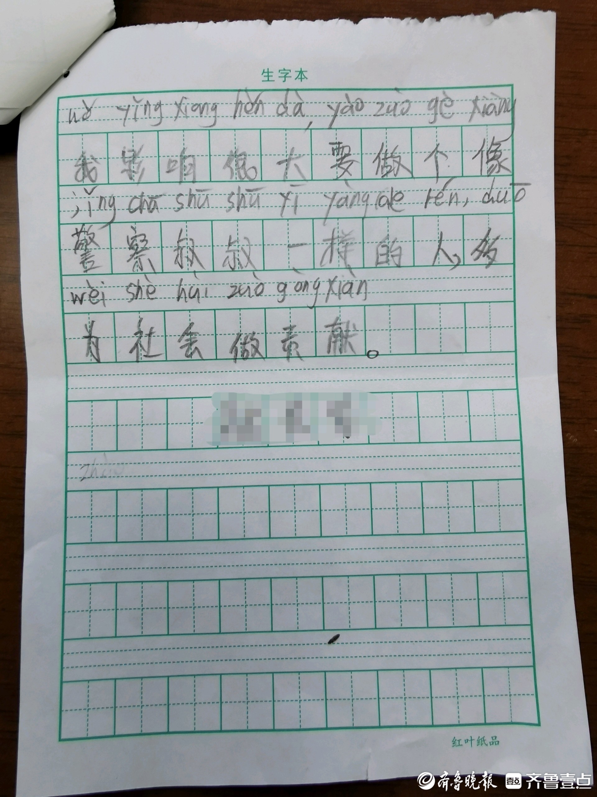 一年级小学生拼音“拼”出感谢信:要做个像警察叔叔一样的人