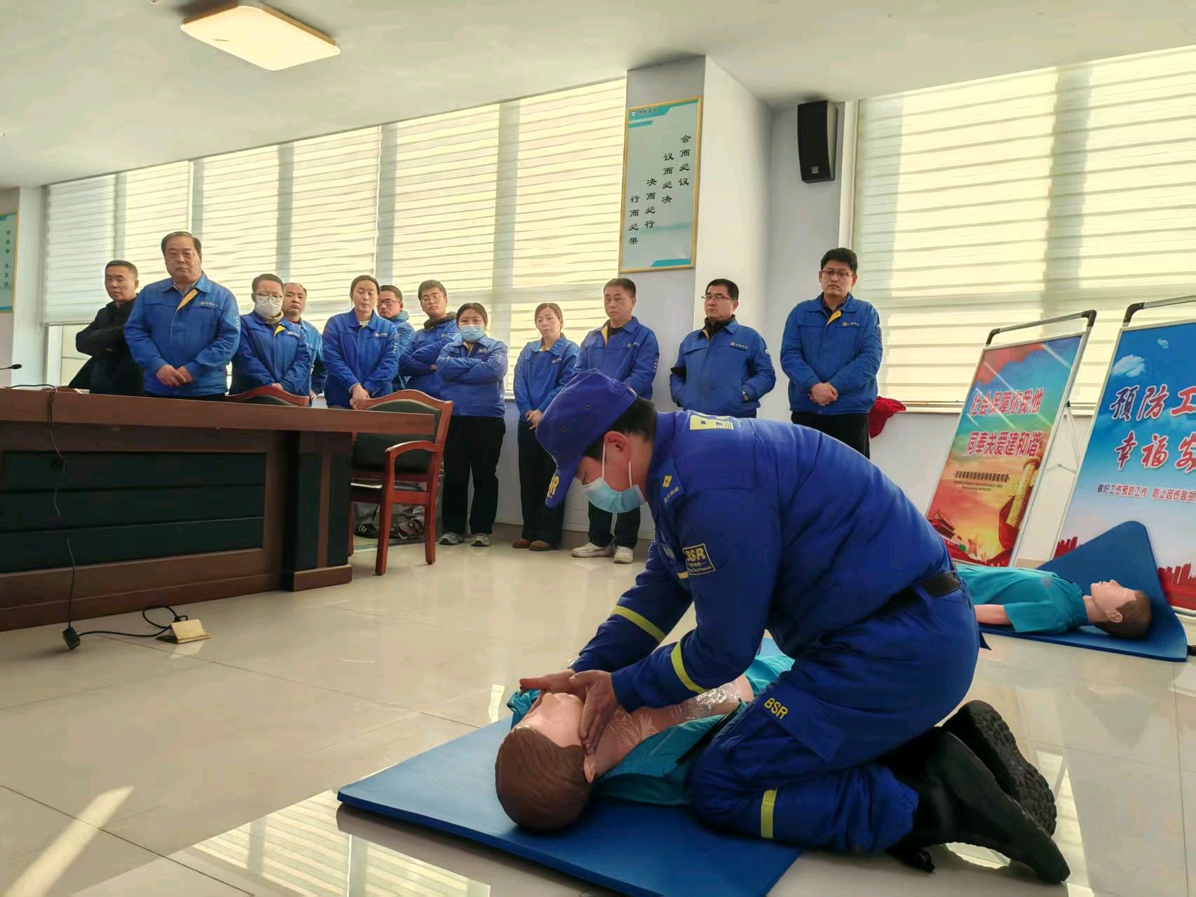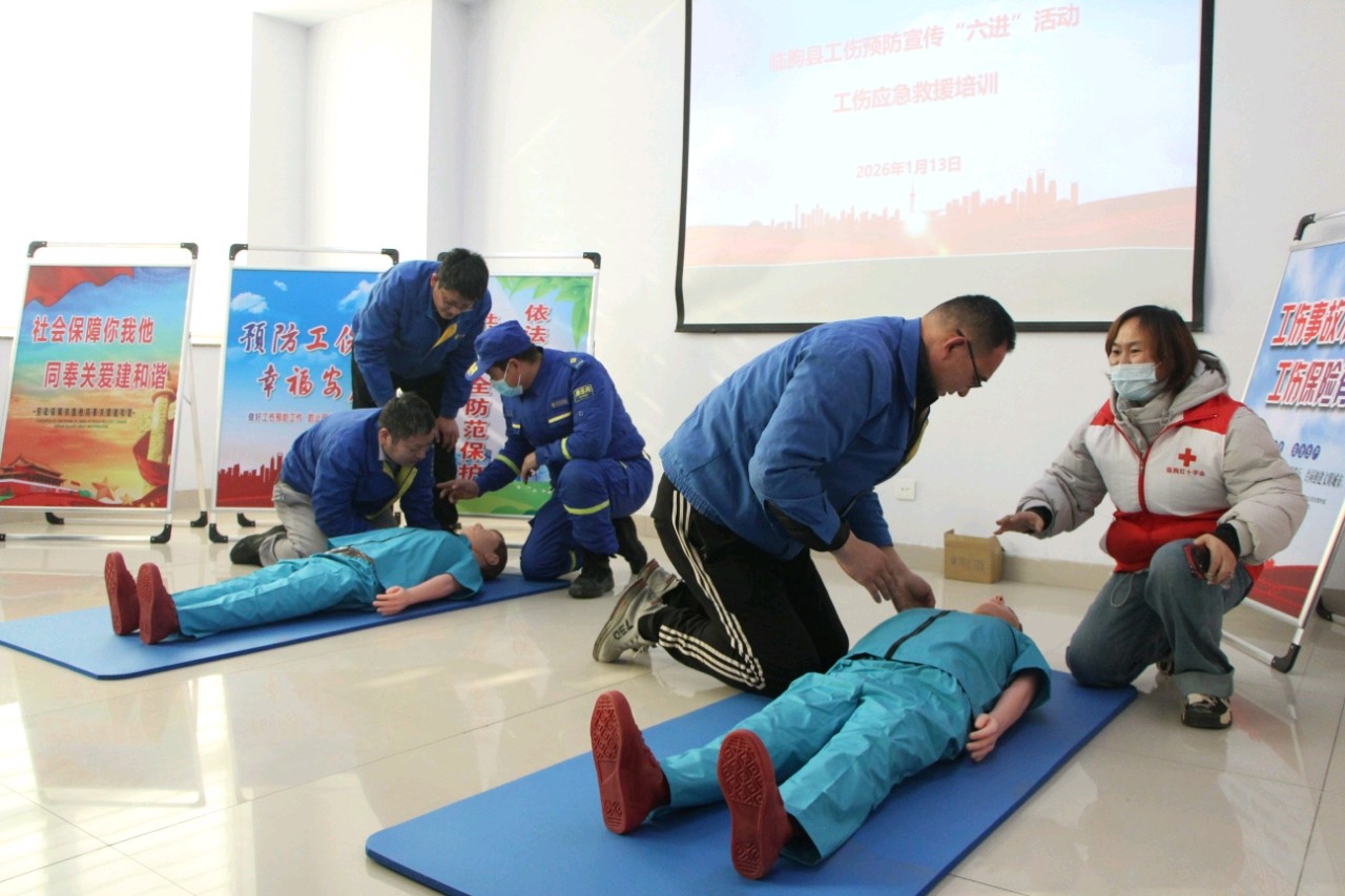 启动仪式上,临朐县社保中心迅速组织专业救援人员及培训讲师开展首轮实地培训和演练。专业讲师结合行业实际,系统解读了工伤预防政策法规,详细讲解了岗位操作规程、安全隐患辨识与排查方法,并重点传授了心肺复苏、创伤包扎等关键急救知识与实操技能。