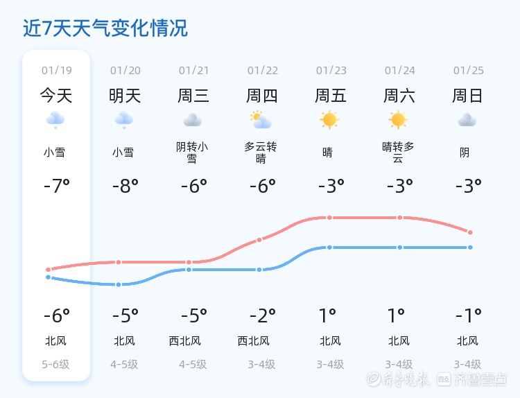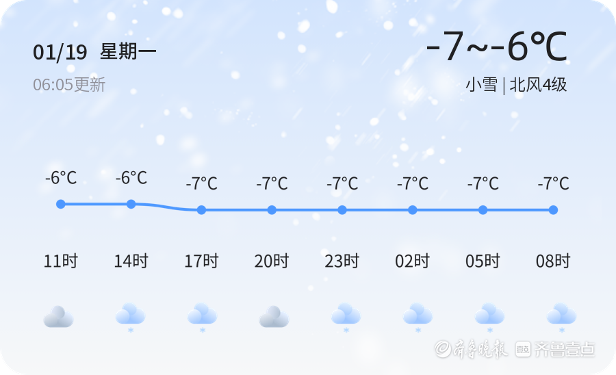 今天是2026年1月19日,星期一,农历十二月初一。威海市今日天气以小雪为主,气温较低,最高气温为-6℃,最低气温为-7℃。北风4级,空气湿度60%,PM2.5指数为23。各区普遍迎来小雪天气,气温较为寒冷,市民出行需注意防寒保暖。据气象部门监测,今日威海市区降雪量较小,但风力较大,体感温度较低,建议市民减少不必要的外出活动,注意保暖。