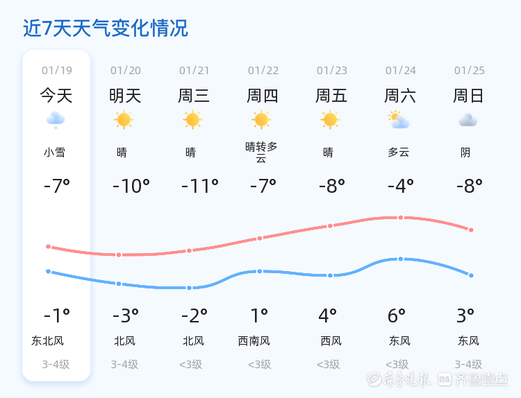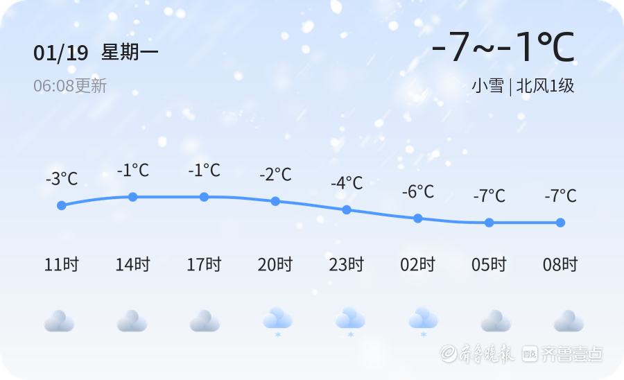 今日是2026年1月19日,农历十二月初一,临沂市迎来小雪天气。全市范围内气温较低,今日最高气温为-1℃,最低气温为-7℃,目前气温为-4.7℃。北风1级,空气湿度82%,PM2.5指数为28,空气质量良好。今日天气以小雪为主,各区气温略有差异,但整体寒冷潮湿,市民出行需注意防寒保暖。
