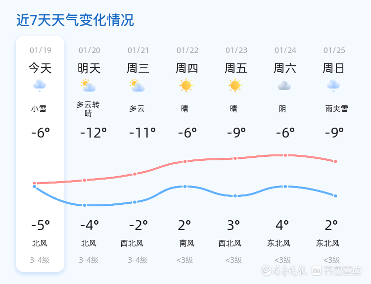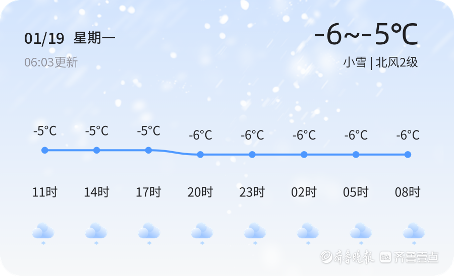 今天是1月19日,星期一,农历十二月初一。潍坊市迎来小雪天气,全市各区气温普遍较低,白天最高气温为-5℃,夜间最低气温为-6℃。目前,潍坊市实时温度为-4.5℃,北风2级,空气湿度70%,PM2.5指数为28,空气质量良好。