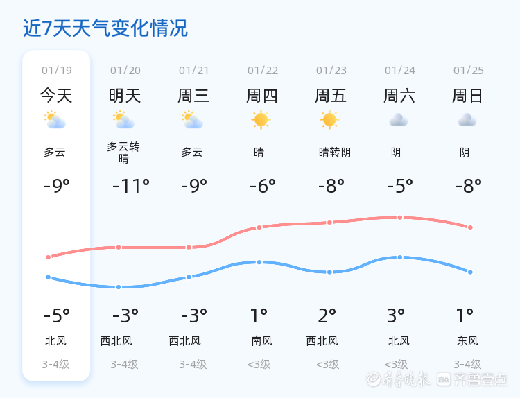 今日是2026年1月19日,星期一,农历十二月初一。东营市迎来新一轮寒潮天气,今日天气多云,气温范围在-9℃至-5℃之间,东北风2级,空气湿度为69%,PM2.5指数为28,空气质量良好。各区气温普遍偏低,市民出行需注意防寒保暖。
