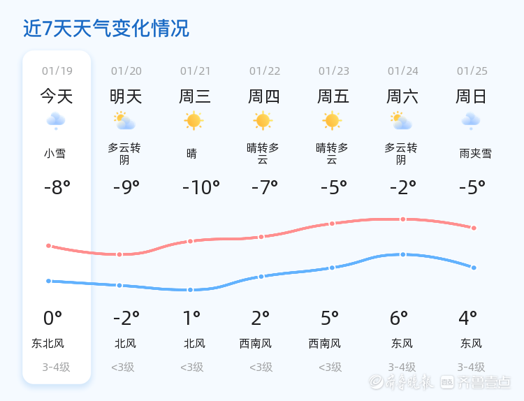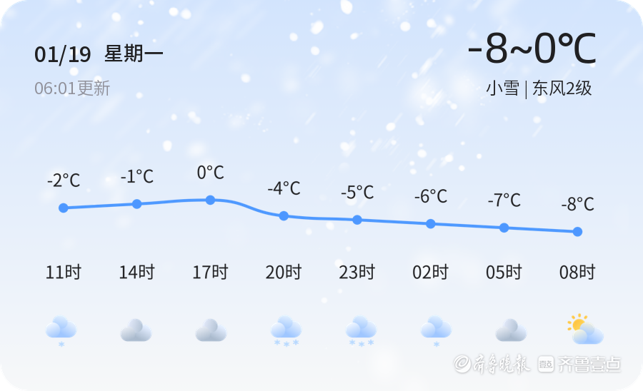 今天是1月19日,星期一,农历十二月初一。枣庄市迎来小雪天气,气温较低,最高气温0℃,最低气温-8℃,目前温度-2.3℃,东风2级,空气湿度81%,PM2.5指数29,空气质量良好。各区县普遍出现小雪天气,气温较低,市民出行请注意防寒保暖。