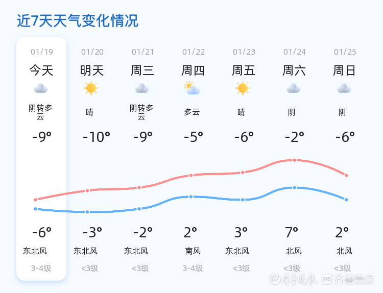 今天是1月19日,星期一,农历十二月初一。济南市迎来了一波降温天气,全市大部分地区以阴转多云为主。气温方面,今天最高气温为-6℃,最低气温为-9℃,目前温度为-5.5℃,风力较小,东风2级,空气湿度为79%,PM2.5指数为35,空气质量良好。市民朋友们请注意保暖,出行时携带雨具,以防天气变化。