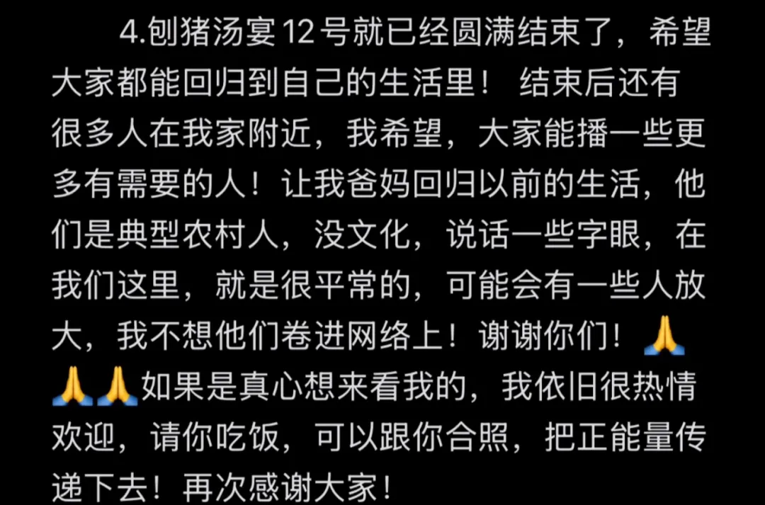 1月16日凌晨3点,“呆呆”再次更新了自己的社交媒体。她称,在重庆合川举办“刨猪宴”已经圆满结束,希望大家都能回归自己的生活。同时,“呆呆”也希望自己的父母能够回归以前的生活,不想让他们卷入网络之中。