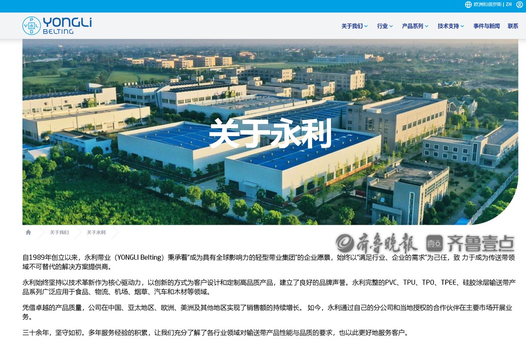 该公司官网显示,自1989年创立以来,永利带业(YONGLI Belting)秉承着“成为具有全球影响力的轻型带业集团”的企业愿景,始终以“满足行业、企业的需求”为己任,致 力于成为传送带领域不可替代的解决方案提供商。