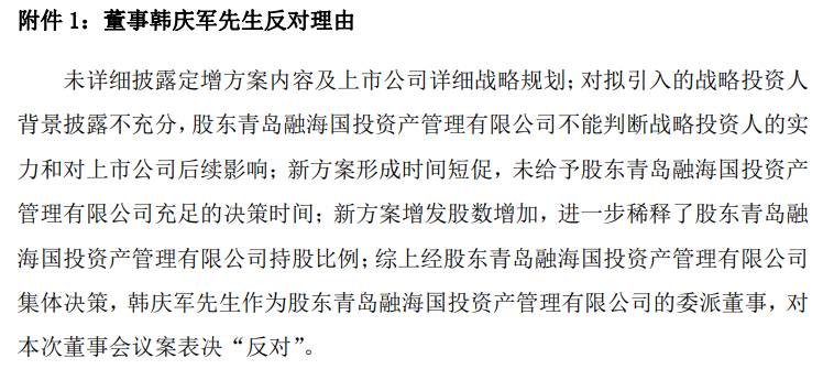 值得关注的是,这场“改善上市公司资产质量和盈利能力”的资本运作却在董事会层面引发分歧。融海国投委派董事韩庆军直指方案披露不充分、投资方背景模糊、决策时间仓促、股权稀释严重四大核心问题,因此投下反对票。