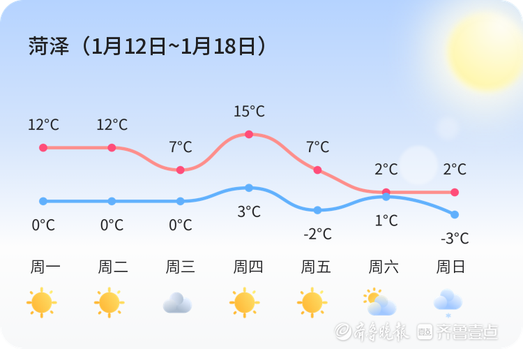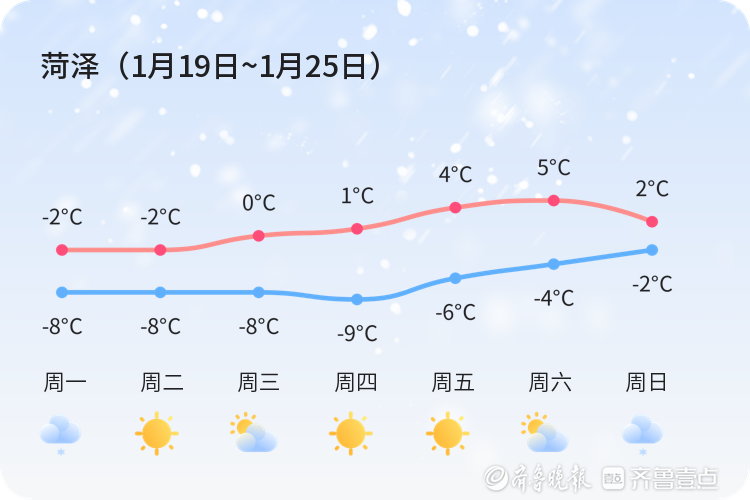 全市周平均最高温1℃,平均最低温-6℃,平均气温-2℃,周最高气温5℃,出现在周六,周最低温-9℃,出现在周四。