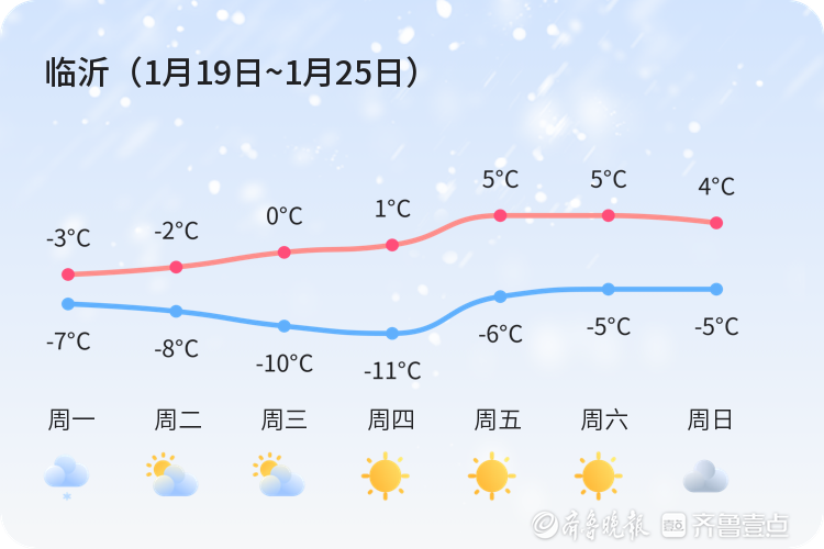 全市周平均最高温1℃,平均最低温-7℃,平均气温-3℃,周最高气温5℃,出现在周五、周六,周最低温-11℃,出现在周四。