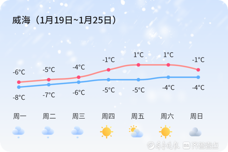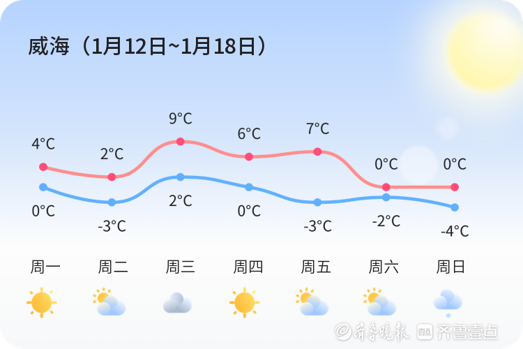 全市周平均最高温4℃,平均最低温-1℃,平均气温1℃,周最高气温9℃,出现在周三,周最低温-4℃,出现在周日。