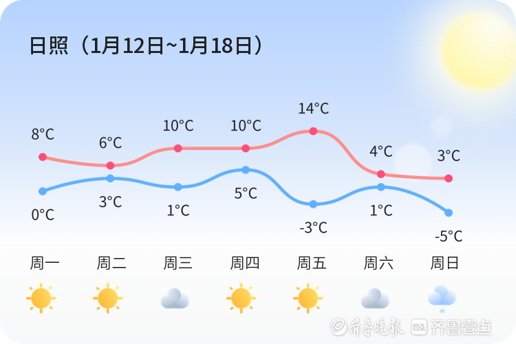 全市周平均最高温7℃,平均最低温0℃,平均气温4℃,周最高气温14℃,出现在周五,周最低温-5℃,出现在周日。