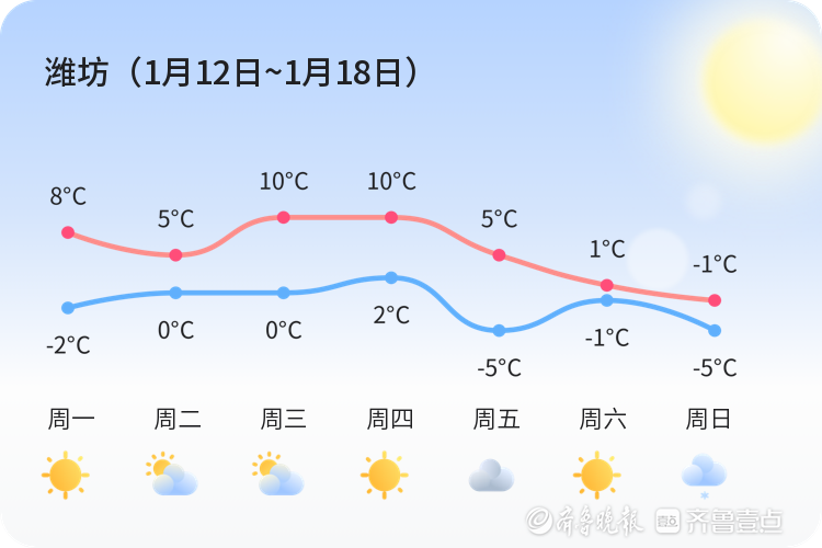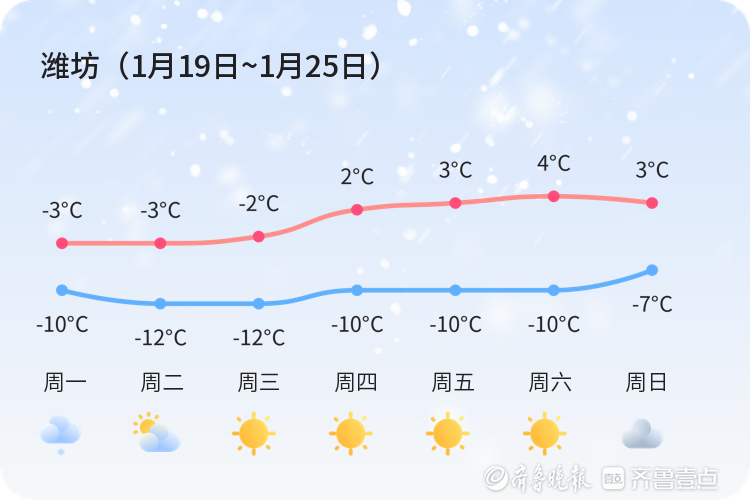 全市周平均最高温0℃,平均最低温-10℃,平均气温-4℃,周最高气温4℃,出现在周六,周最低温-12℃,出现在周二、周三。