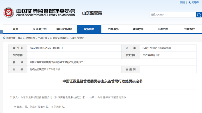 1月16日,证监会山东监管局官网公示的行政处罚决定书(〔2026〕2号)显示,山东朗进科技股份有限公司(以下简称朗进科技或公司)以及4名相关责任人因涉超4亿资金占用等多项违法违规合计被罚款1015万元。