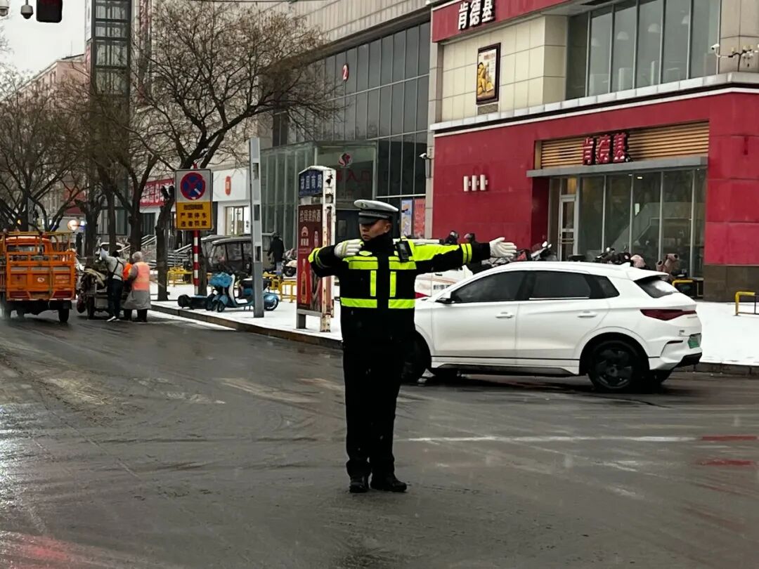 针对道路结冰、湿滑情况,交管部门在全市重点路口、路段、坡道增派警力,加强指挥疏导。