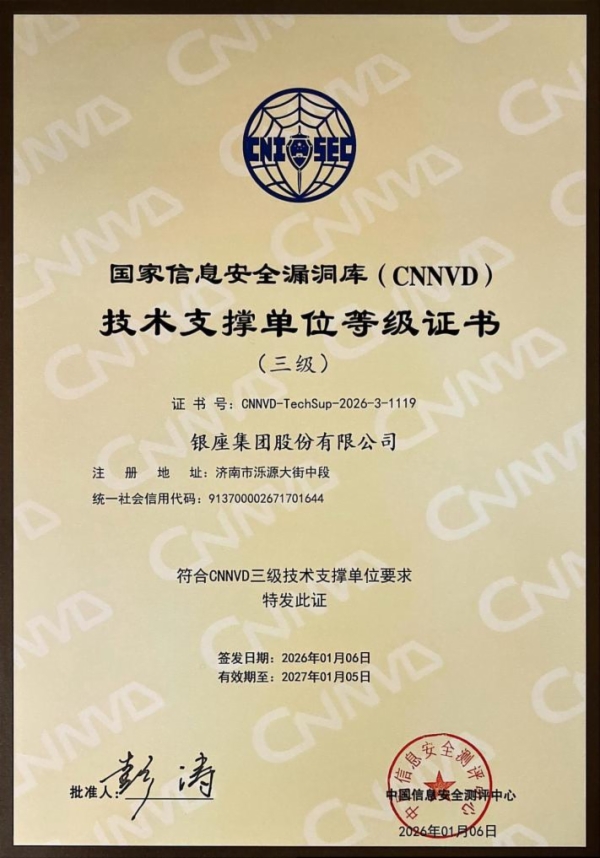 鲁商集团所属银座集团获评国家信息安全漏洞库(CNNVD)三级技术支撑单位