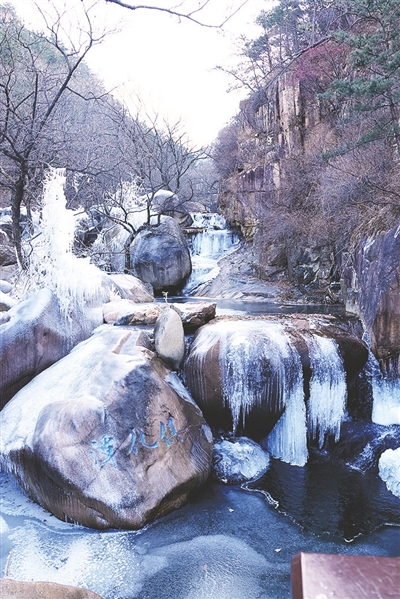 若说雾凇是为崂山披上的素裳,那冰瀑便是冬日以寒冰为刃雕刻的艺术。九水游览区中,往昔欢腾的溪涧在低温中渐渐沉寂,化作一道道悬垂的冰河,静默展开崂山冬日的瑰丽长卷。