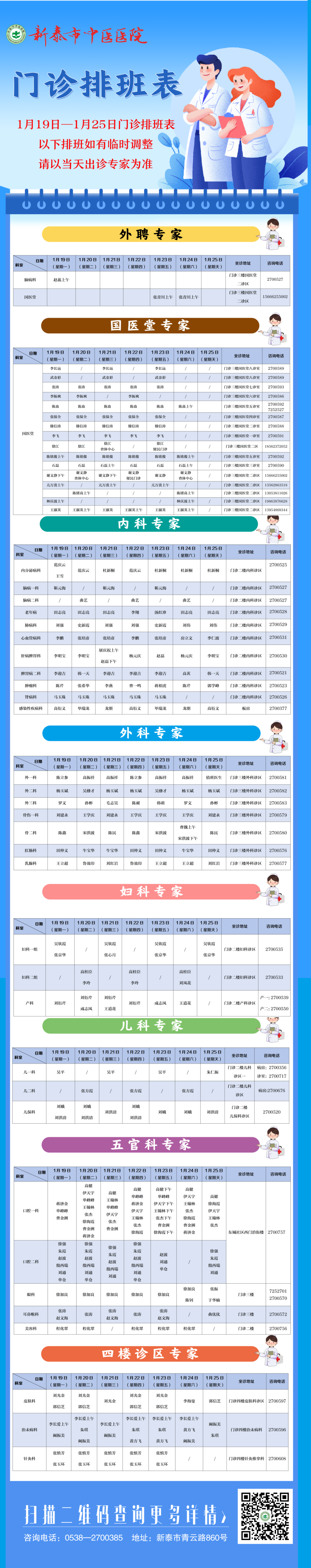 新泰市中医医院1月19日—1月25日门诊排班表来了,快来预约您心仪的专家吧~