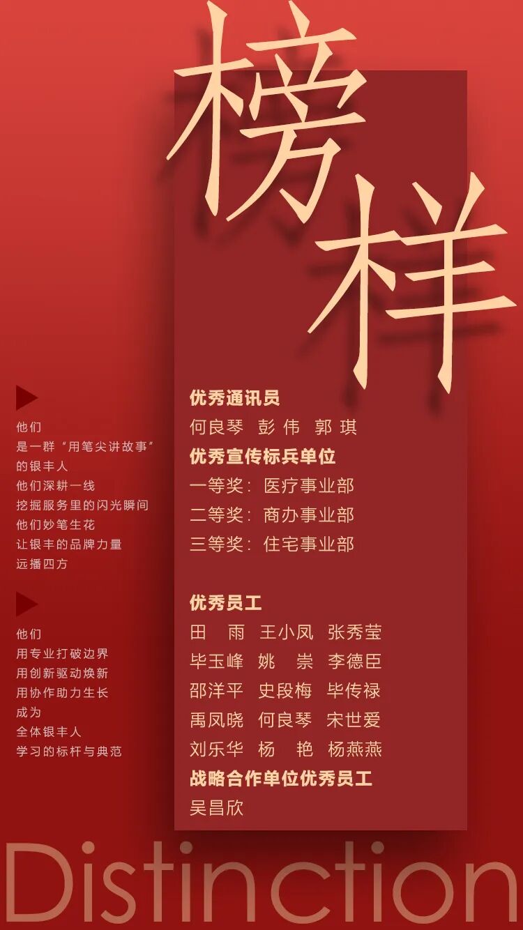 表彰环节,银丰物业集团对过去一年中表现突出的优秀宣传标兵单位、优秀通讯员、优秀员工等3个先进集体和19名先进个人进行表彰。