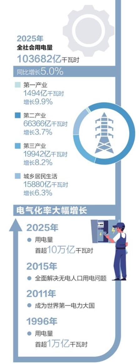 103682亿千瓦时!国家能源局最新发布的数据显示,2025年,我国全社会用电量首超10万亿千瓦时,为全球首次。