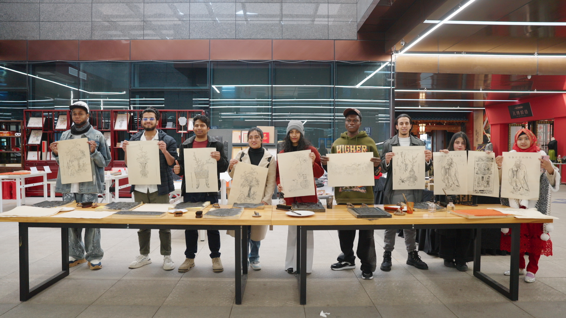 在互动体验区,留学生们亲手尝试了传统木板拓印技艺。在非遗代表性传承人的指导下,他们手持鬃刷,以“三轻三重”的力道敲打宣纸,将孔子行教像的轮廓细细拓印。来自尼日利亚的Momodu捧着刚完成的拓片,墨香萦绕鼻尖:“这不仅是一项技艺,更是与历史对话的方式,每一次敲打都让我感受到文化传承的重量。”