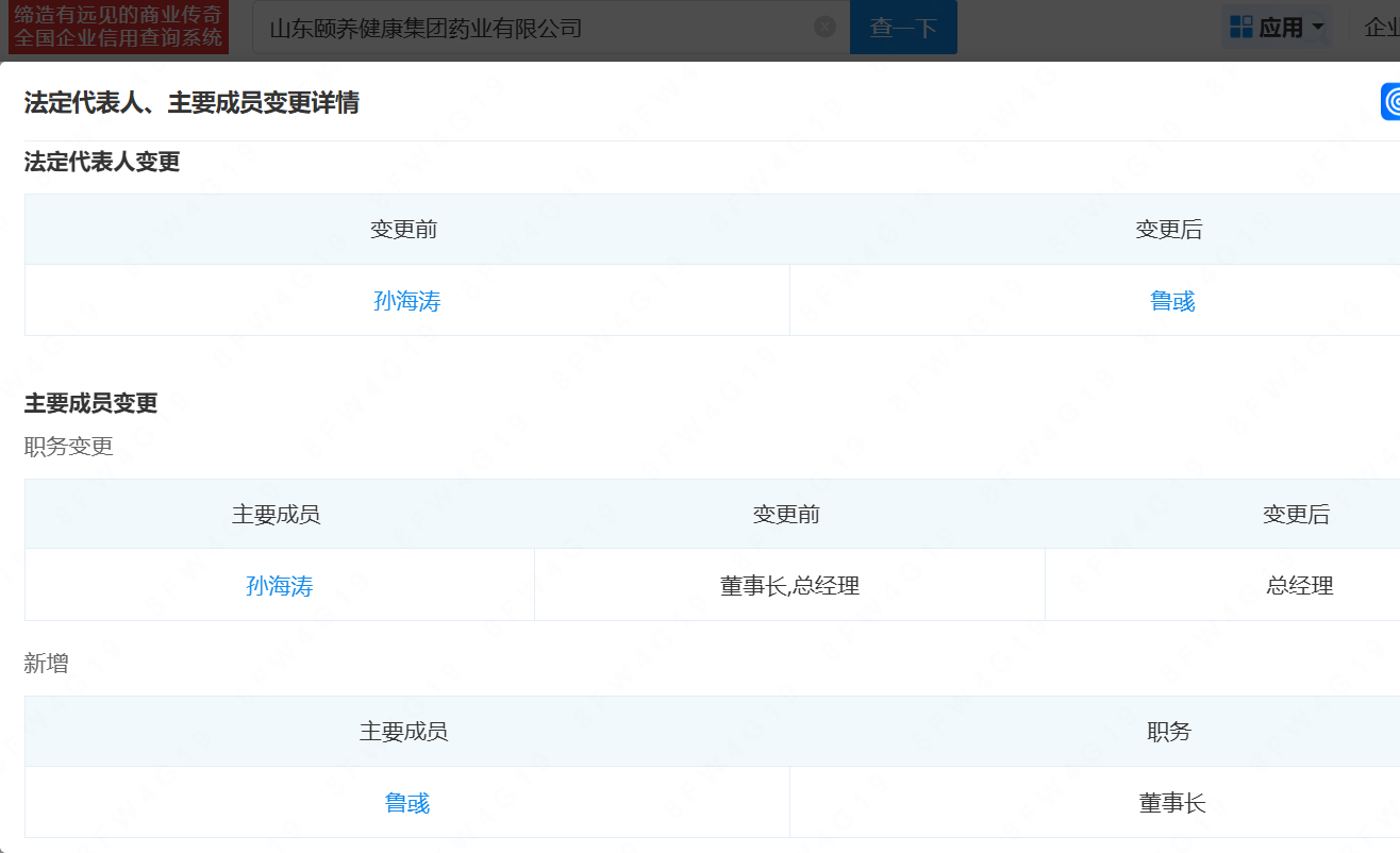 企查查显示,日前,山东颐养健康集团药业有限公司(下称“山东颐养健康药业”)发生工商变更,鲁彧接替孙海涛就任公司法定代表人及董事长。目前,孙海涛依然担任公司总经理。