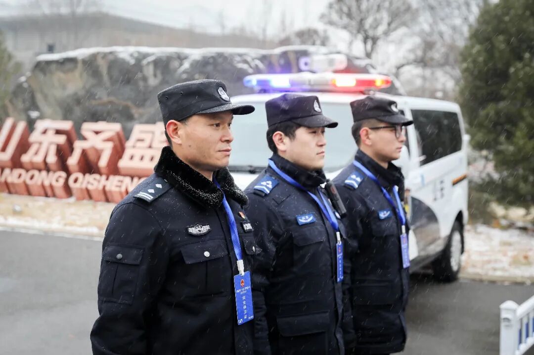 当天,淄博市两会召开,民警在会场周边及路口执勤,冒雪引导车辆、维持秩序,保障道路畅通与安全。