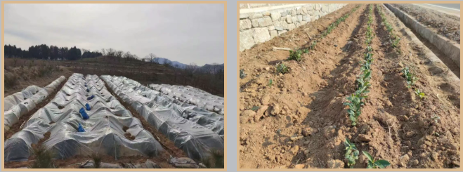 (3)半培土越冬。半培土越冬适用于1年生黏土茶园或过沙茶园,行距较大的2龄茶园也可以采用。用半干不湿的土将茶苗培护至约1/3-1/2茶苗高度处,同时在茶行北侧用草遮挡,茶行内覆盖3-5cm稻草或者湿草。