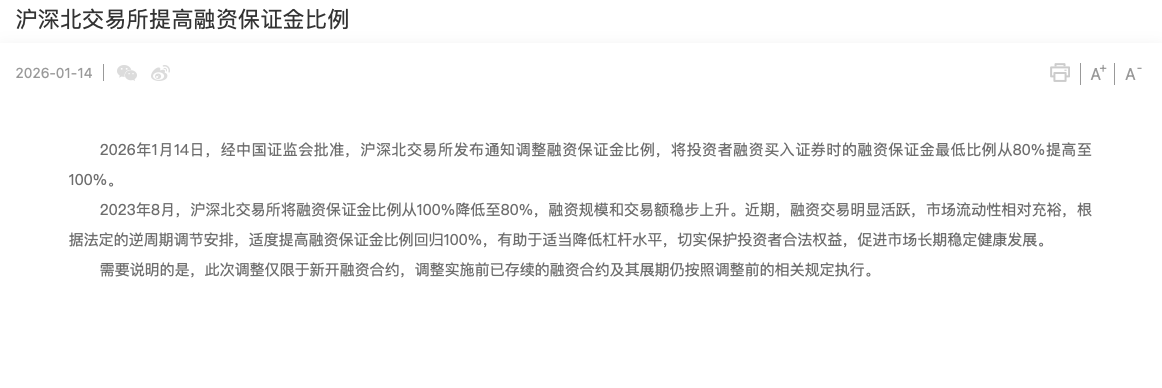 经中国证监会批准,沪深北交易所发布通知调整融资保证金比例,将投资者融资买入证券时的融资保证金最低比例从80%提高至100%,相关安排自1月19日起正式施行。