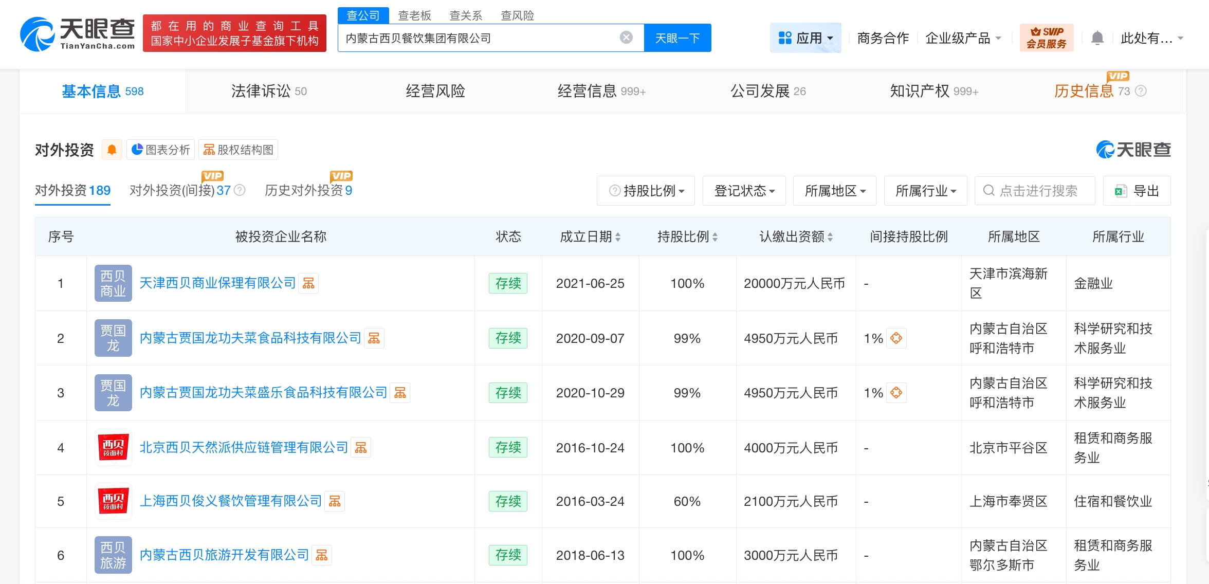 天眼查工商信息显示,西贝关联公司内蒙古西贝餐饮集团有限公司成立于2017年10月,法定代表人为贾国龙,注册资本约8990万人民币,经营范围含餐饮服务、食品生产、食品互联网销售、食品销售、餐饮管理、普通货物仓储服务、以自有资金从事投资活动等。股东信息显示,该公司由北京西贝企业管理有限公司、贾国龙、呼和浩特市人生喜悦企业管理中心(有限合伙)等共同持股。对外投资信息显示,该公司直接持股近190家企业,其中150余家企业为存续状态,30余家企业已注销。