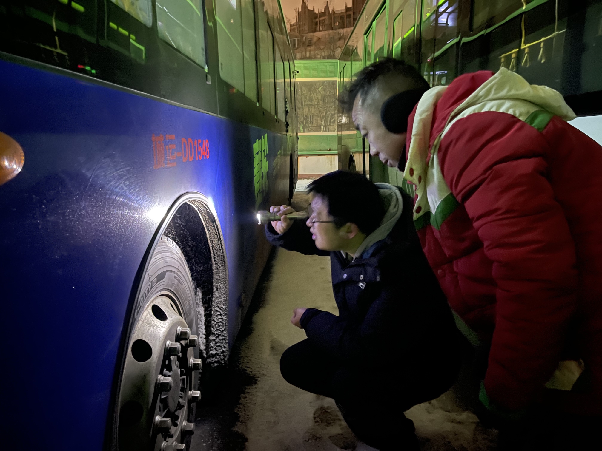 凌晨四点的公交停车场,夜色未褪、风雪正急。隧道巴士公司316路驾驶员于军已提前一个多小时到岗,打着手电对车辆轮胎、雨刮片、发动机舱、刹车系统等进行细致“雪地体检”,刮除轮胎纹路内的硬冰,确保车辆抓地力与行车安全。“这种天气,车况是安全的第一道防线,一点都马虎不得。”完成检查后,于军又与安全员一同在站点周边撒布融雪剂,防范乘客滑倒。5点15分,于军驾驶首班车平稳驶离场站,成为风雪中劈开黑暗的温暖光束。据了解,为做好车辆运营保障工作,城运控股集团各营运单位路队长、机务人员彻夜值班值守,技术员、维修工及驾驶员提前到岗,对车辆门泵、轮胎、制动、灯光等关键部位进行全面检修,首班车发车前15分钟启动车辆预热,确保车况安全、准点发出。