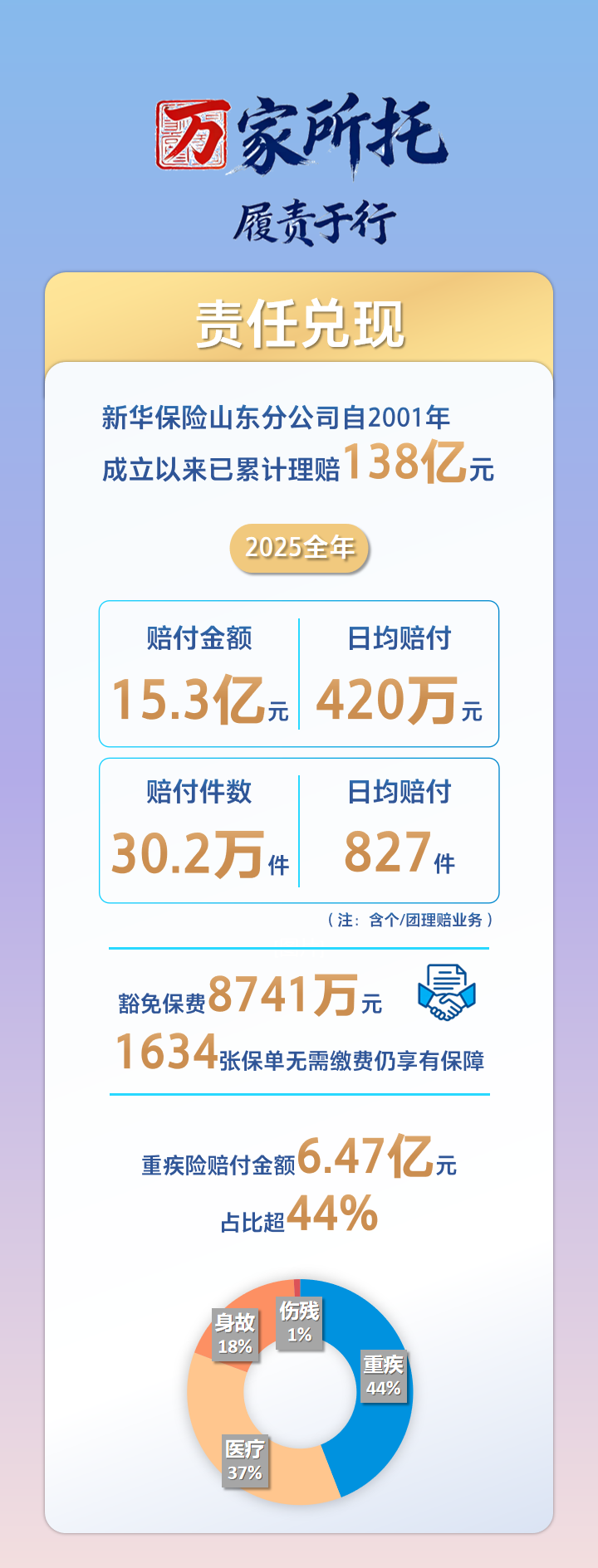 这一年,新华保险山东分公司赔付15.3亿元,用专业传递温度,用速度诠释责任。每笔赔款,都是点亮齐鲁万家灯火的一份安心。新华保险,继续守护每一份托付,许长久美好,守未来可期。