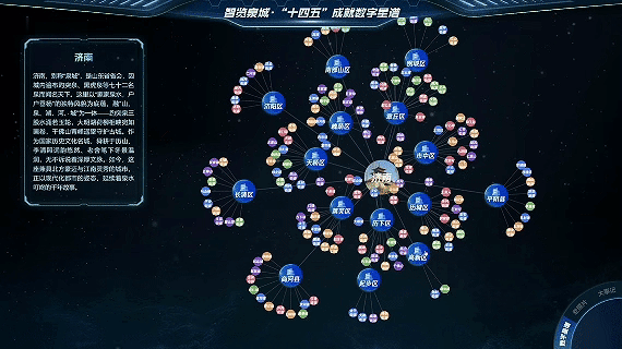济南数字星谱融合大模型与知识图谱等技术,创新构建济南各区县街镇发展的数字星图。它不仅动态呈现城市演进历程,更以直观、联动的方式展现发展脉络,让数字信息承载时代轨迹,焕发新颖的表达力。