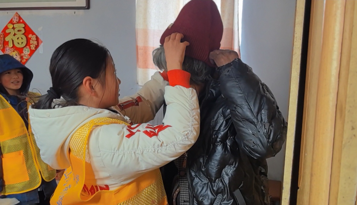 培训结束后,6支志愿小队迅速集结,在老师和家长志愿者的带领下分头入户,每组负责走访3户老人。走进老人家中,同学们立刻送上精心准备的暖心物资,为老人戴上保暖的棉帽与红围巾,递上能驱散寒意的热水袋,贴上寓意吉祥的福字与对联。孩子们围在老人身边,有的耐心倾听老人讲述过去的故事,有的主动帮忙打扫庭院、整理房间,有的用稚嫩的声音送上真诚的祝福,欢声笑语填满了农家小院。老人们脸上洋溢着幸福的笑容,握着孩子们的手久久不愿松开,寒冷的冬日因这份双向奔赴的温暖变得格外温馨。