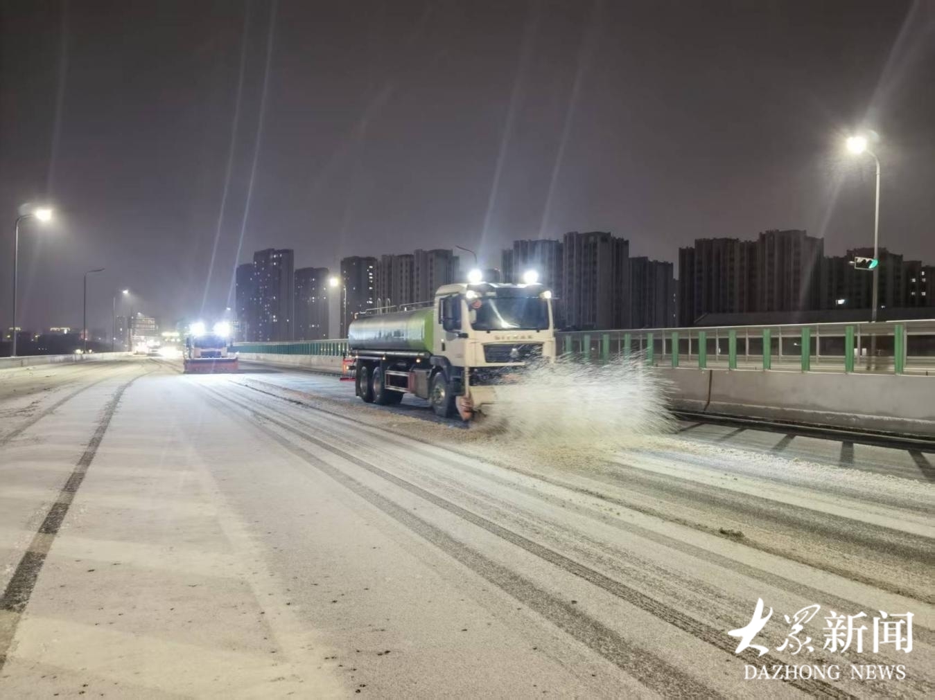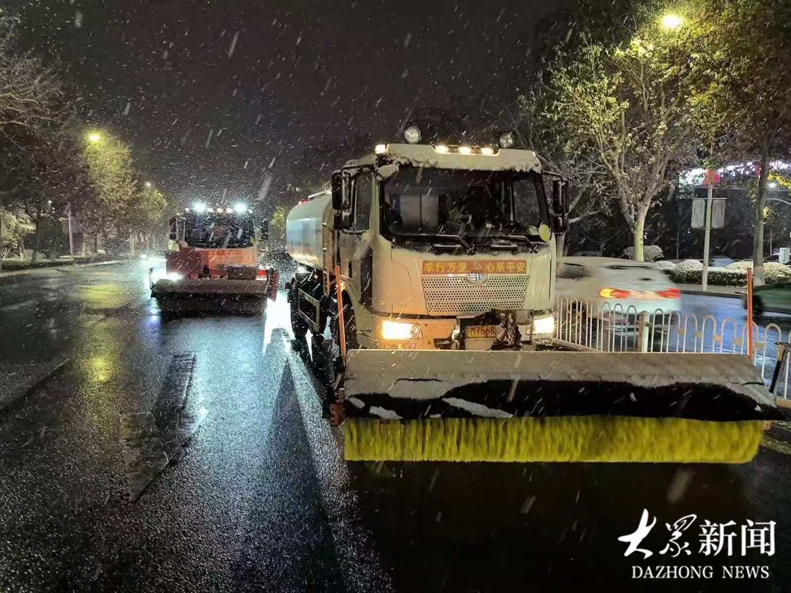 1月18日凌晨4时,各区县陆续出现降雪,环卫部门迅速启动应急处置预案。初期雪量较小时,优先安排人工清理非机动车道、人行道积雪,同步重点整治主路面雪泥、积水,有效防范路面打滑风险。伴随降雪持续加剧,气温骤降导致路面出现结冰现象,环卫专业除雪队伍发扬连续作战、轮班轮岗的实干精神,采取“机械除雪+融雪剂撒布”相结合的方式连夜奋战,全力保障周一早高峰道路通行安全。