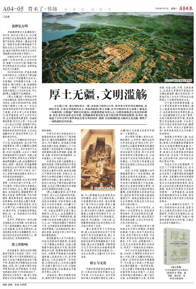 公元前221年,秦王朝实现大一统,而在此之前的3000年,是中华文明史的关键时段。英国汉学家、牛津大学教授杰西卡·罗森的新作《厚土无疆:古代中国的今生与来世》,聚焦这一关键时段,以跨越广袤时空距离的12座墓葬遗址为切入点,从跨区域物质文化交流的视角,综合多学科诠释古代中国,试图重构华夏先民生前与死后世界的鲜活图景。在书中,她阐述了中华文明与世界其他主要文明的同步、独到,以及跨越欧亚大陆的文化交融,展现了一场跨越时空的壮游。