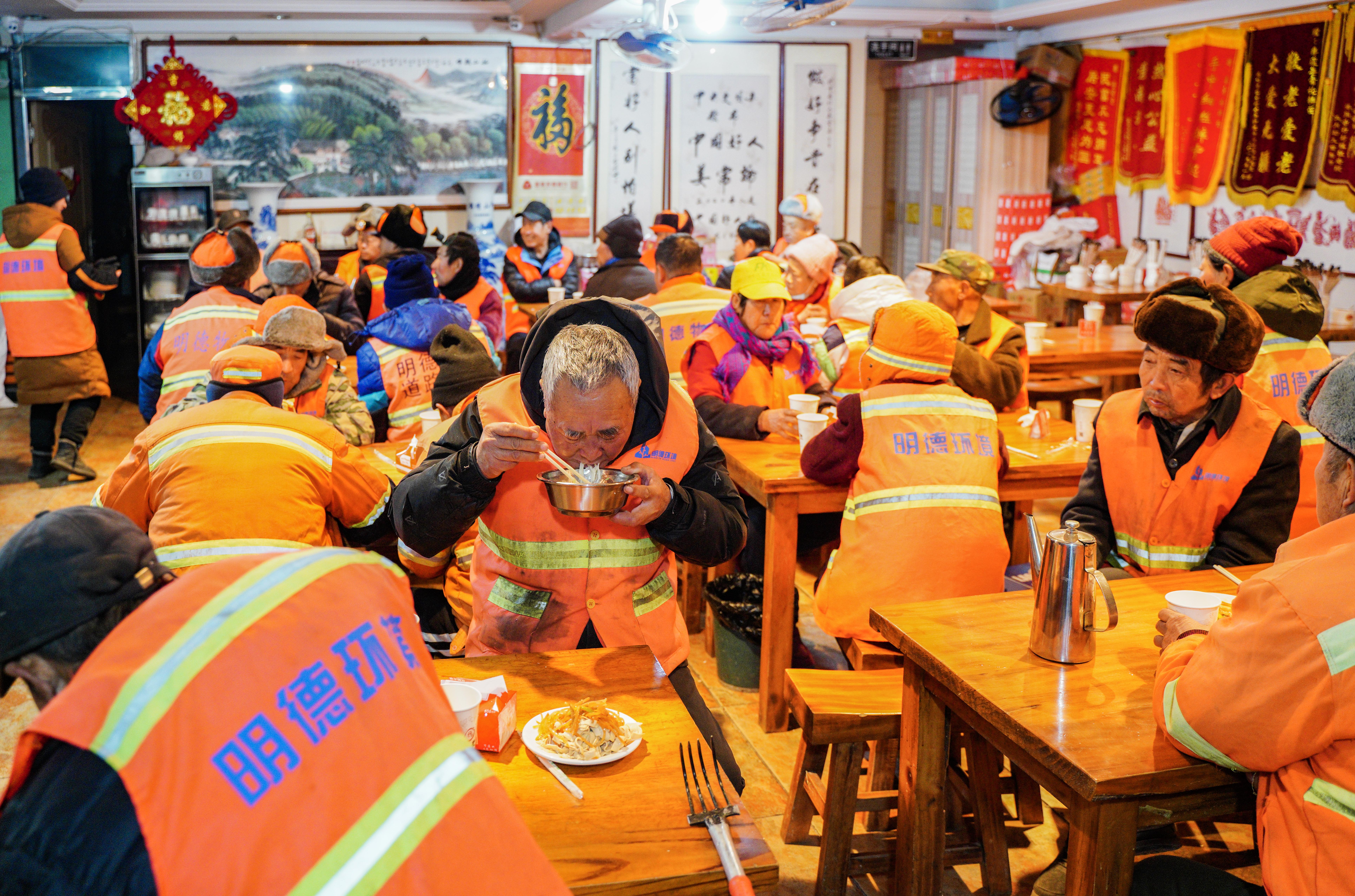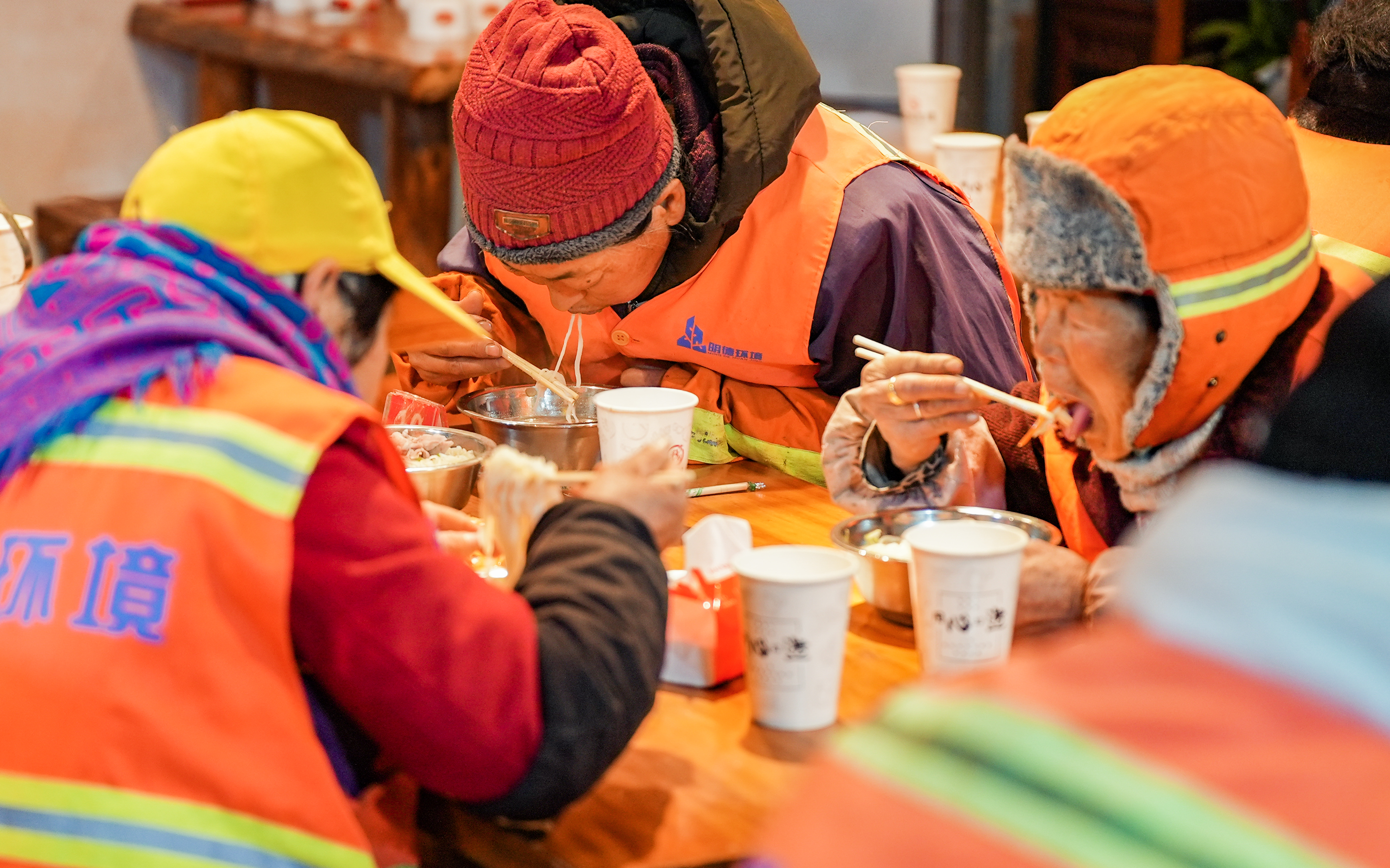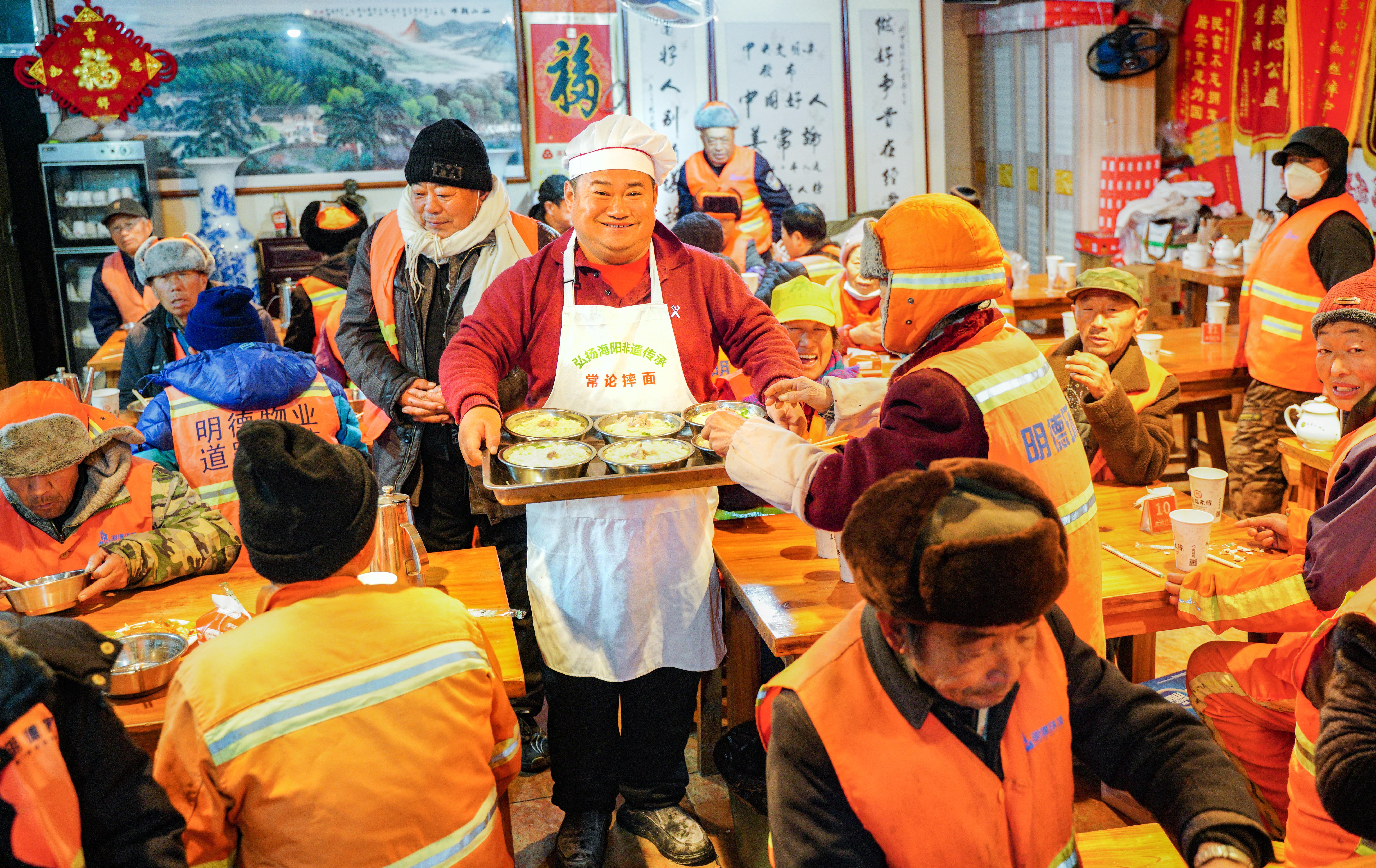 岁月或许在他脸上留下了痕迹,但他眼中的热忱与信念,始终如初。一碗碗手工摔面,凝结的是姜常论的汗水与辛劳。此后每到寒冬腊月,他和弟弟姜常才便每日凌晨3点起床,揉面、熬骨汤、煮鸡蛋、备小菜,5点准时为环卫工人送上热气腾腾的摔面套餐。十二载寒冬里,无论面对何种压力,他始终如约在清晨打开店门,为寒风中劳作的“城市美容师”备好这份温暖。当环卫工人搓着冻红的双手走进小店,接过那碗热气腾腾的面条时,温暖的不只是身体,更是那颗在冷风中坚守的心。这一碗面,盛满的是尊重,是关怀,也是一份无声的致敬。