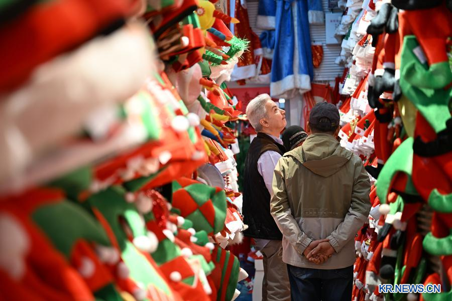 지난 2025년 12월 17일 저장(浙江)성 이우(義烏)국제비즈니스성에서 크리스마스 상품 샘플을 고르는 쿠웨이트 상인. (사진/신화통신)