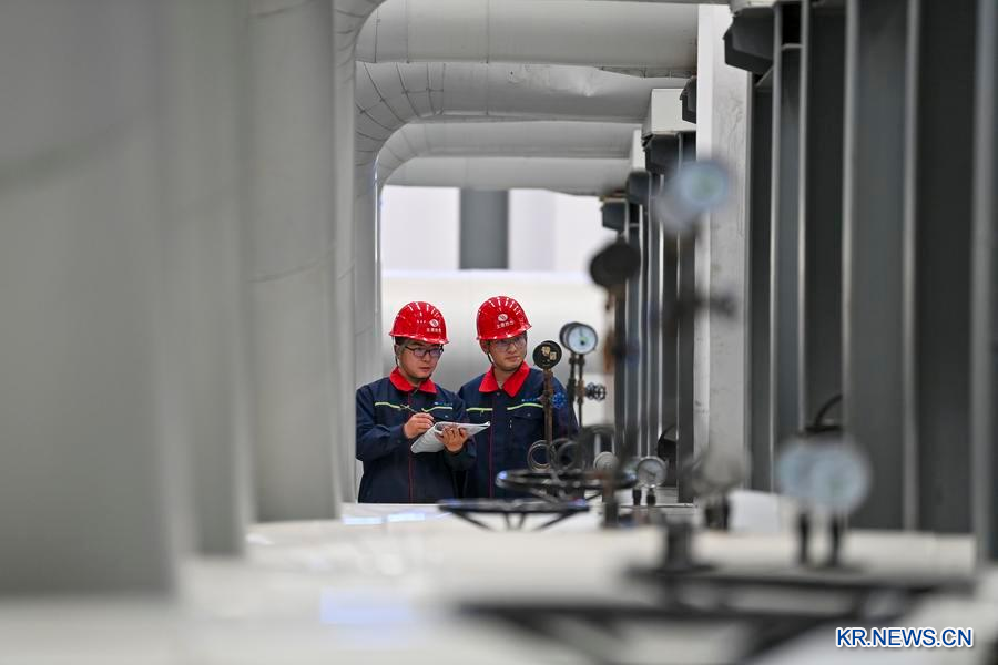 2025년 10월 19일 산시(山西)성 타이위안(太原)시 열에너지그룹회사의 중계에너지스테이션에서 설비 운영 상황을 점검하고 기록하고 있다. (사진/신화통신)