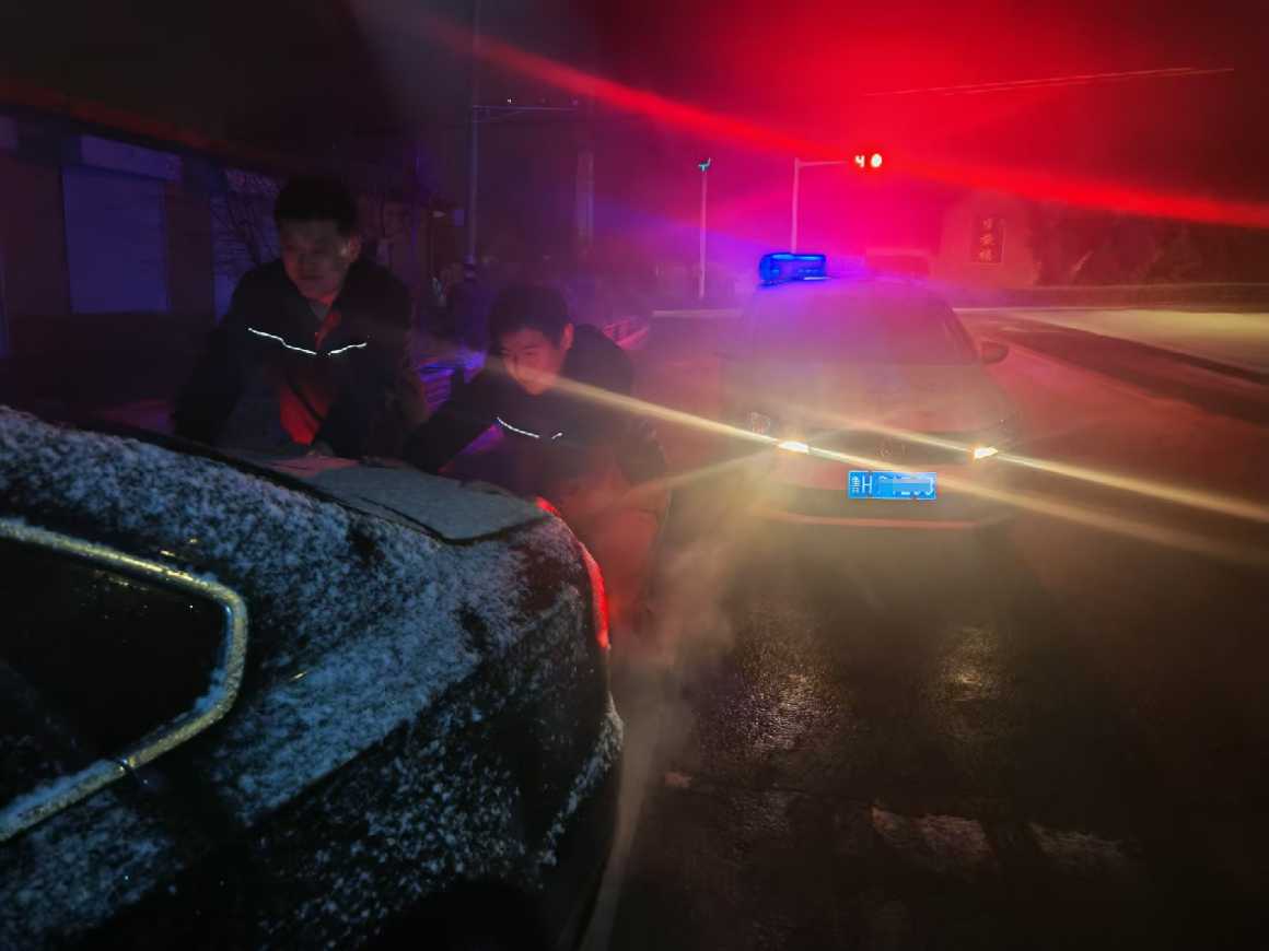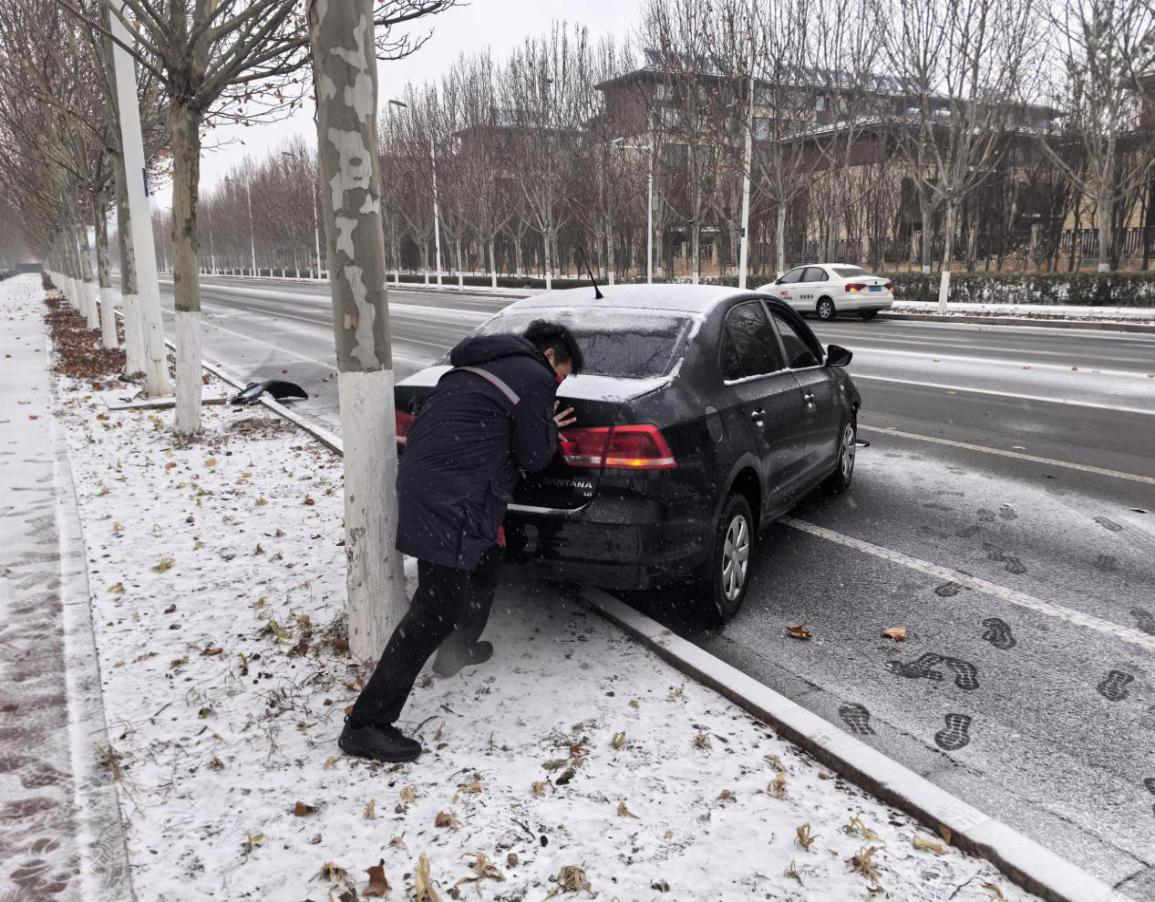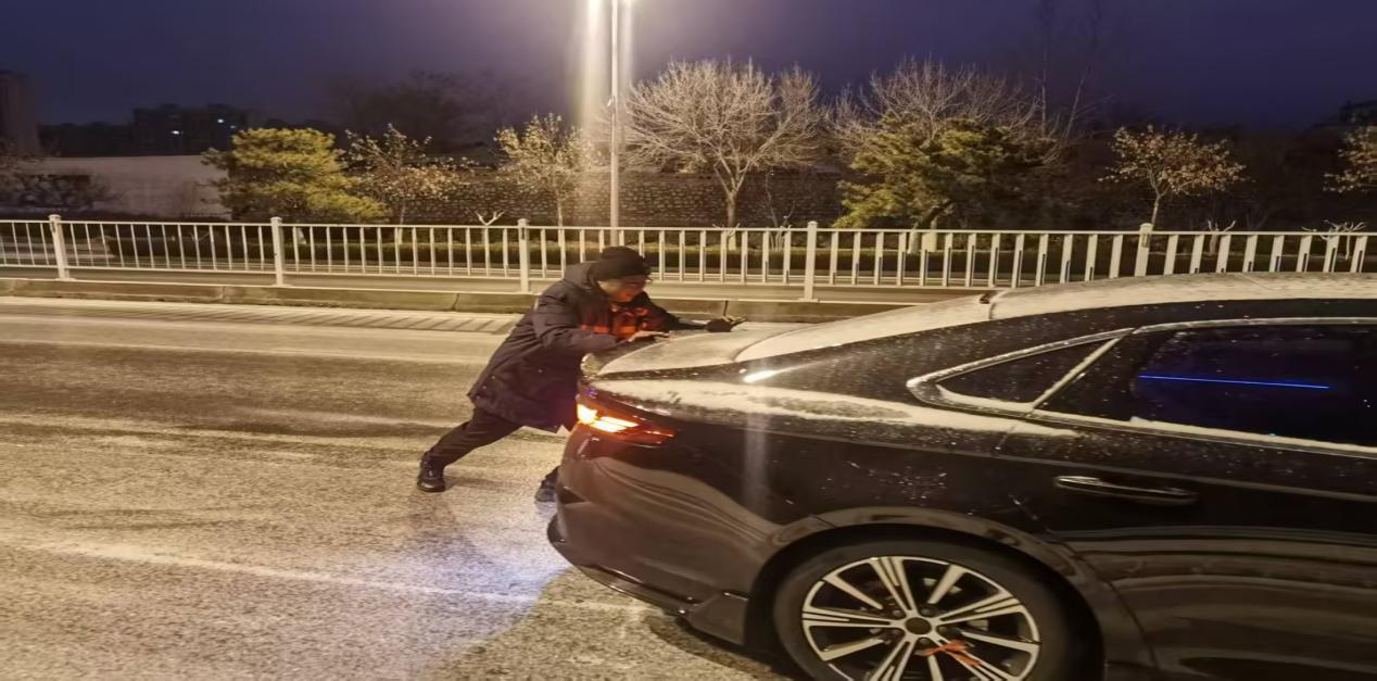 泰安分公司查勘员谢鹏青雪夜接到客户报案,发现车辆在结冰坡路打滑无法行驶,他立即设置警示标志,冒严寒全力推车,帮助车辆安全驶离打滑路段,客户紧握他的手连声道谢。