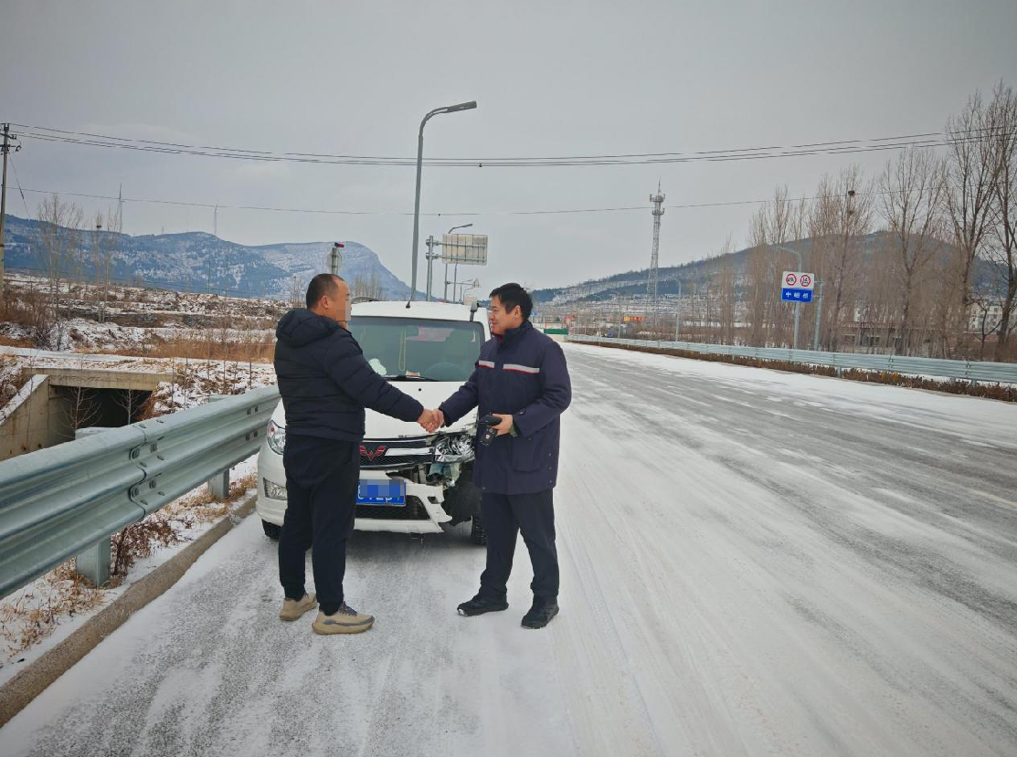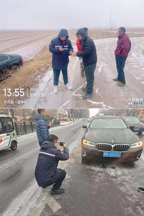 聊城查勘员主动巡视桥梁、坡道等易结冰路段,联动救援单位拖移被困车辆,化身“安全宣传员”传递防滑知识。