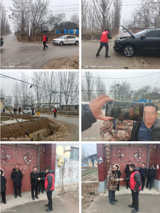 聊城分公司接到偏远路口事故报案后,线上线下协同作战,线上理赔员联动线下查勘员穿越百余里冰雪小路,查勘员克服路面湿滑、差点翻车的困难赶到现场;同时通过“警保联动 一键直赔”功能远程对接交警,快速完成事故认定与维修定损,让老年客户无需奔波。
