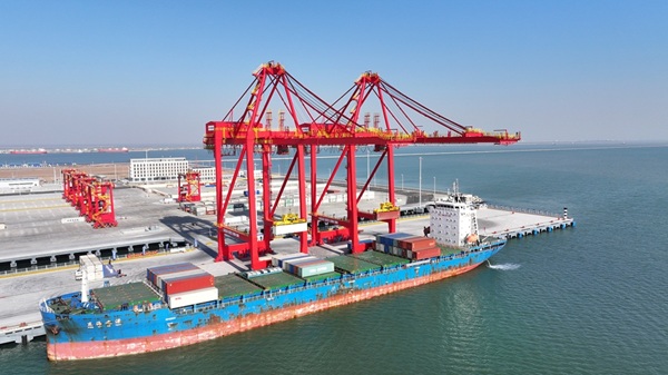 The vesselDonghaizhiyuandocked at Dongying Port during cargo loading operations for the route's maiden voyage. [Photo/IC photo]