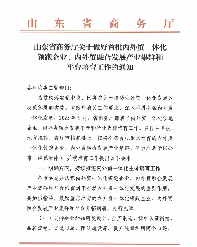 推动内外贸一体化发展,是贯彻落实党中央、国务院决策部署,畅通国内国际双循环、构建新发展格局的重要举措。为深入推进全省内外贸一体化进程,山东省商务厅于2025年9月启动培育工作,旨在打造一批具有标杆性的融合发展载体,为全省外贸高质量发展注入新动能,经过多轮评审与筛选,青云通平台最终成功入选。