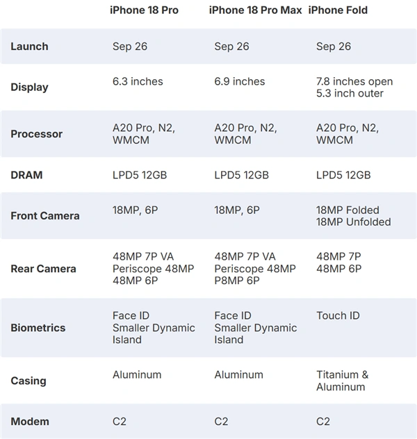 现在,分析师在报告中介绍了iPhone 18 Pro、iPhone 18 Pro Max和iPhone Fold的详细参数。