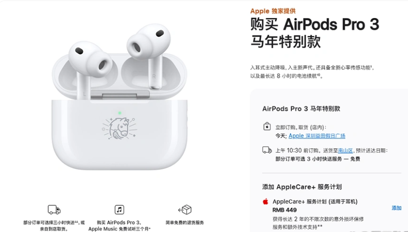 除了数字内容,苹果也推出实体限定产品。AirPods Pro 3马年特别款现已上市,充电盒表面激光镌刻有苹果独家设计的马年Emoji表情符号,该图案无法通过常规镌刻服务获得,售价为1899元。